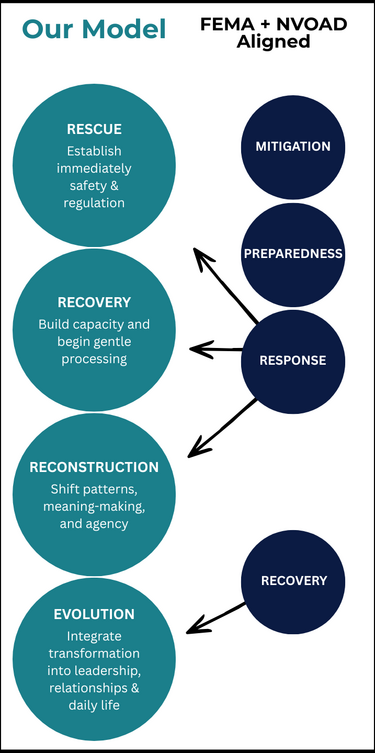 "Our organization participated in this program after seeing how unrecognized trauma-response activation can create real setbacks in relationship management. We’ve gained daily validation and confidence in acknowledging trauma responses and improving because of that awareness. We recommend this program to any disaster-response professional working in response and/or recovery who wants to broaden their ability to support partners and survivors impacted by disaster - exponentially."